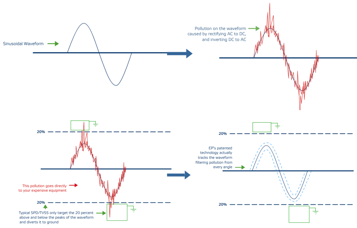 A 'whole house surge protector' is a device designed to be installed at the main electrical service panel or a sub panel. Nearly all the products available on the market incorporate shunt mode surge protection technology that degrades over time and whose performance relies on the quality of the building's ground protection. In many homes and studios this ground is often of poor quality, with a impedance often over 20 or 30 ohms at 60Hz. At higher frequencies this impedance can be substantially greater, almost nullifying the ability of the surge protector to control the most damaging high frequency spikes. The technology in the Environmental Potentials EP-2050-EE is different. It does not rely on the quality of the ground to provide surge protection. The device tracks the waveform, damping high frequency, high rate of change impulses. That's why the EP-2050-EE is called a 'Waveform Corrector'!